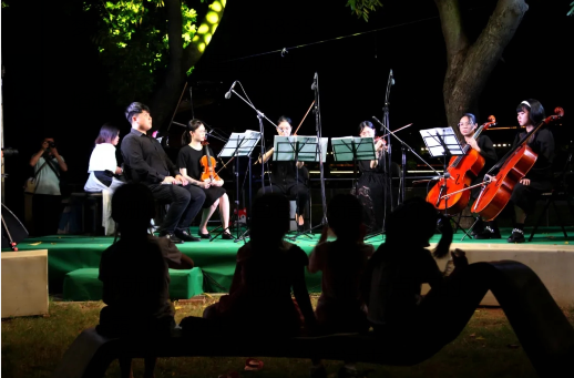 东莞室内乐学会乐团先后演奏了约翰·斯特劳斯的《蓝色多瑙河圆舞曲》、舒伯特的《军队进行曲》《小夜曲》、贝多芬《欢乐颂》等13首乐曲。演奏形式上包括了钢琴两重奏到钢琴五重奏,曲乐风格上包括了从古典音乐曲到浪漫主义音乐的代表性乐曲。乐团的倾情演奏,带来了观众的全情观赏。当演奏到圆舞曲的时候,一些小朋友情不自地拉着自己的妈妈在榕树下翩翩起舞。草坪周边护河栏杆上围满了附近的乡亲。优美的环境,优雅的乐曲,构成了当晚最浪漫的与大自然、与音乐的相遇。(东莞+)