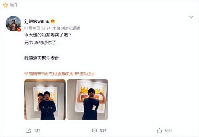 都知道,网上已经出现了许多的刘畊宏女孩儿和刘畊宏男孩儿,就是不知道啥时候周杰伦也会囊括在这里面,网友纷纷叮嘱,希望刘畊宏可以带着周杰伦健身,让周杰伦瘦下来,这是一举两得的事情,不过就在网友为周杰伦担心身材的时候,刘畊宏晚间就晒出了一组和周杰伦的合照,配文中写道:“今天送的奶茶喝够了吧?兄弟,真的想你了…我愿意再帮你变壮。”