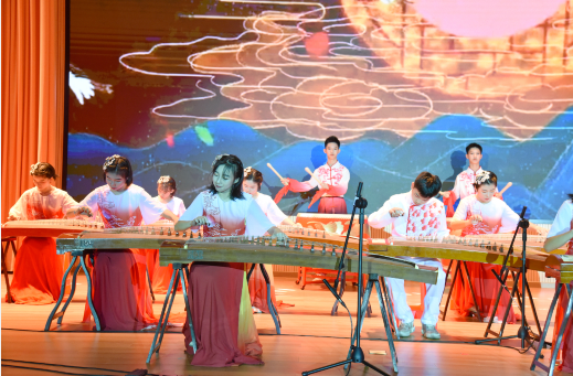 晚上7时30分,横沥中学古筝乐团以一曲《盛世国乐》拉开音乐会序幕。只见学生们时而扫弦,时而弹跳,指尖飞动间用音乐勾勒出一幅大气磅礴的盛世景象。一曲奏罢,现场掌声雷动。随后,横沥禁毒宣传形象大使赵浚承与新候鸟乐队共同演唱了横沥禁毒原创歌曲《生命之光》。横沥中学学生代表、新候鸟乐队轮番上台,倾情献唱《知不知道》《奔跑》等耳熟能详的曲目,清亮的歌声和轻快的旋律在体育馆久久回荡。活动还穿插了舞蹈《情深谊长》等表演,展示了学生自信向上的精神面貌,更为观众们带来了高质量的视听盛宴。