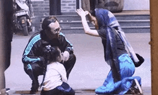 周迅认真教小女孩跪拜,神态专注认真。两人在街上认真跪拜,过了一会儿后被其他人扶起来离开。