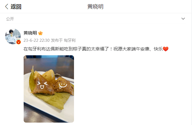 而近期正在录制综艺节目《极限挑战》的黄晓明,也在深夜的时候,晒出了一张粽子的照片,他也为此配文:“在匈牙利布达佩斯能吃到粽子真的太幸福了!祝愿大家端午安康、快乐”。