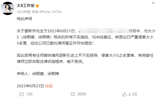 这次大S小S没有姑息,直接通过工作室宣布要起诉葛斯齐,还说已经取证好了。大S小S的回应,让葛斯齐非常不满,他表示自己说的都是事实,为什么只告他不告黄子佼。葛斯齐虽然表现很委屈,但他也没有任何大S小S吸毒嗑药的证据,很大可能是败诉。