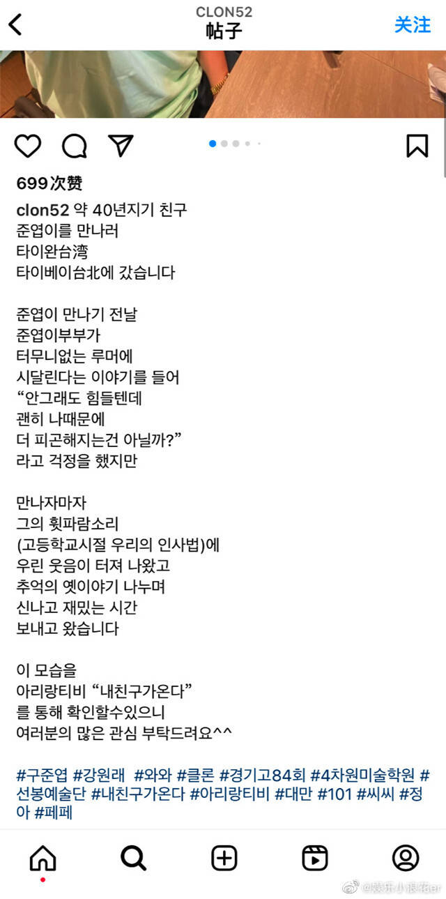 25日姜元来发文,他去了台北和具俊晔见面,在韩国时他很担心具俊晔会被谣言影响,也担心自己的到来对具俊晔造成困扰。不过见面后具俊晔很开心,两个人在台北留下了美好回忆。