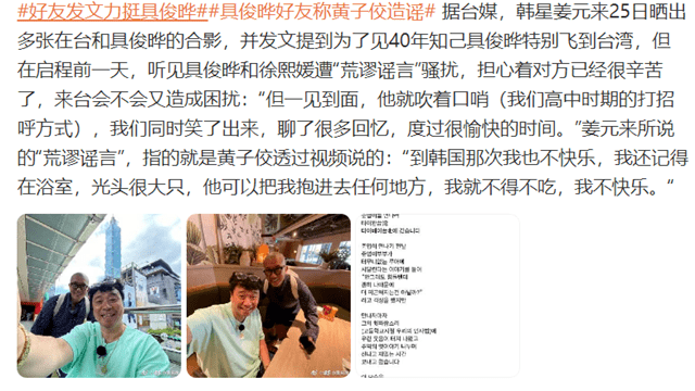 6月25日,据台媒报道,韩国歌手姜元来晒出多张和具俊晔的合照,两人见面也是让酷龙组合再次合体,姜元来更是力挺具俊晔,否认他吸毒的传言,怒斥黄子佼是在造谣。