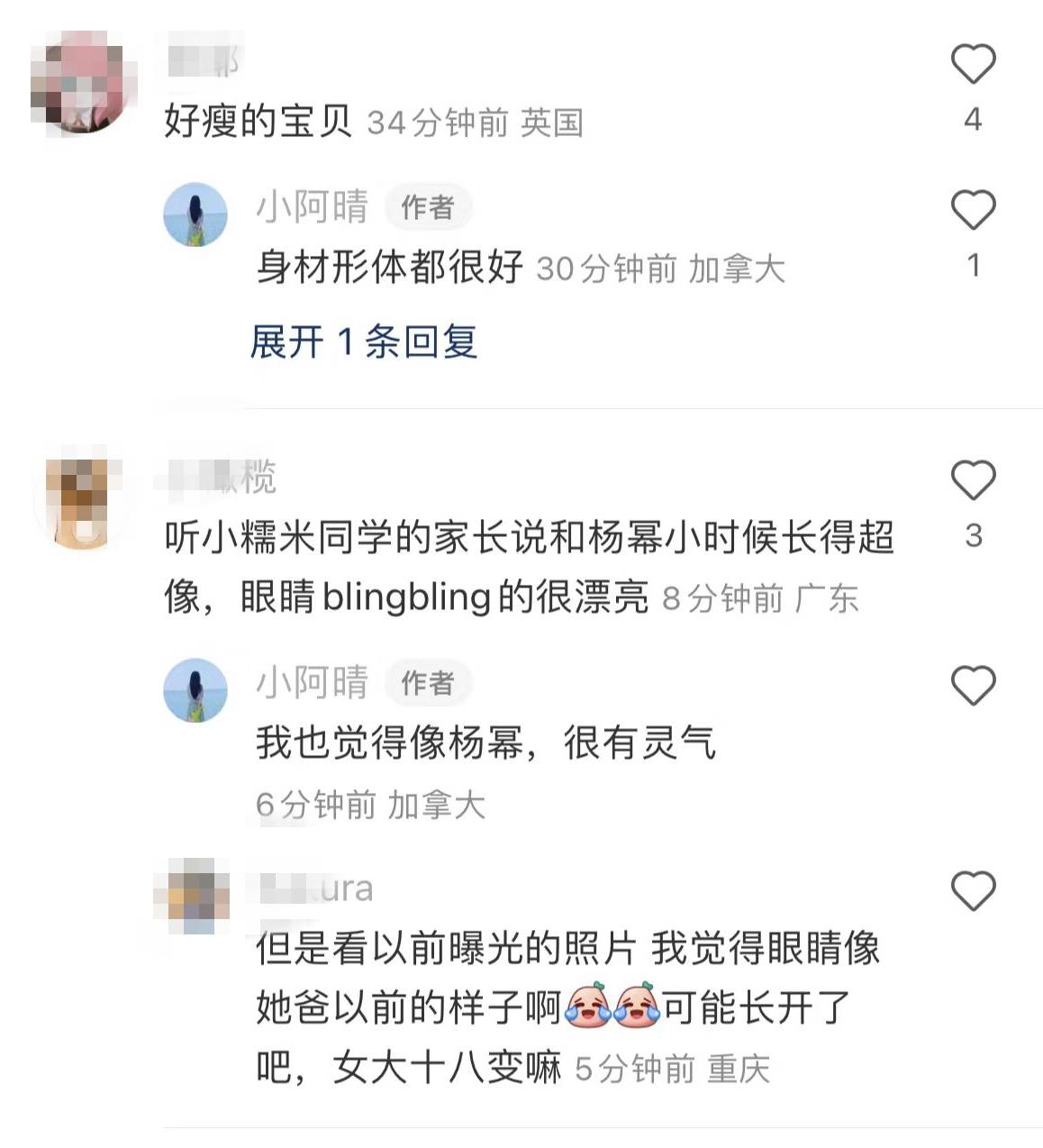 楼主在留言区透露,小糯米的颜值非常高,遗传了妈妈杨幂的神颜,是标准的“第一眼美女”。