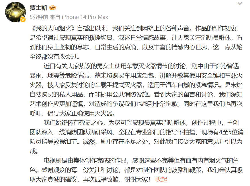搜狐娱乐讯 7月20日,《我的人间烟火》出品人贾士凯回应剧中灭火器争议情节:“是宋焰自费购买的私人用品,而非挪用公共消防设施。”他表示为尽可能展现最真实消防群体,创作过程中,主创团队深入一线消防团队调研采风,全程在专业部门的指导下拍摄。他感谢观众的关注和讨论:“我们会认真吸取大家真诚的建议,再次诚挚致歉。”