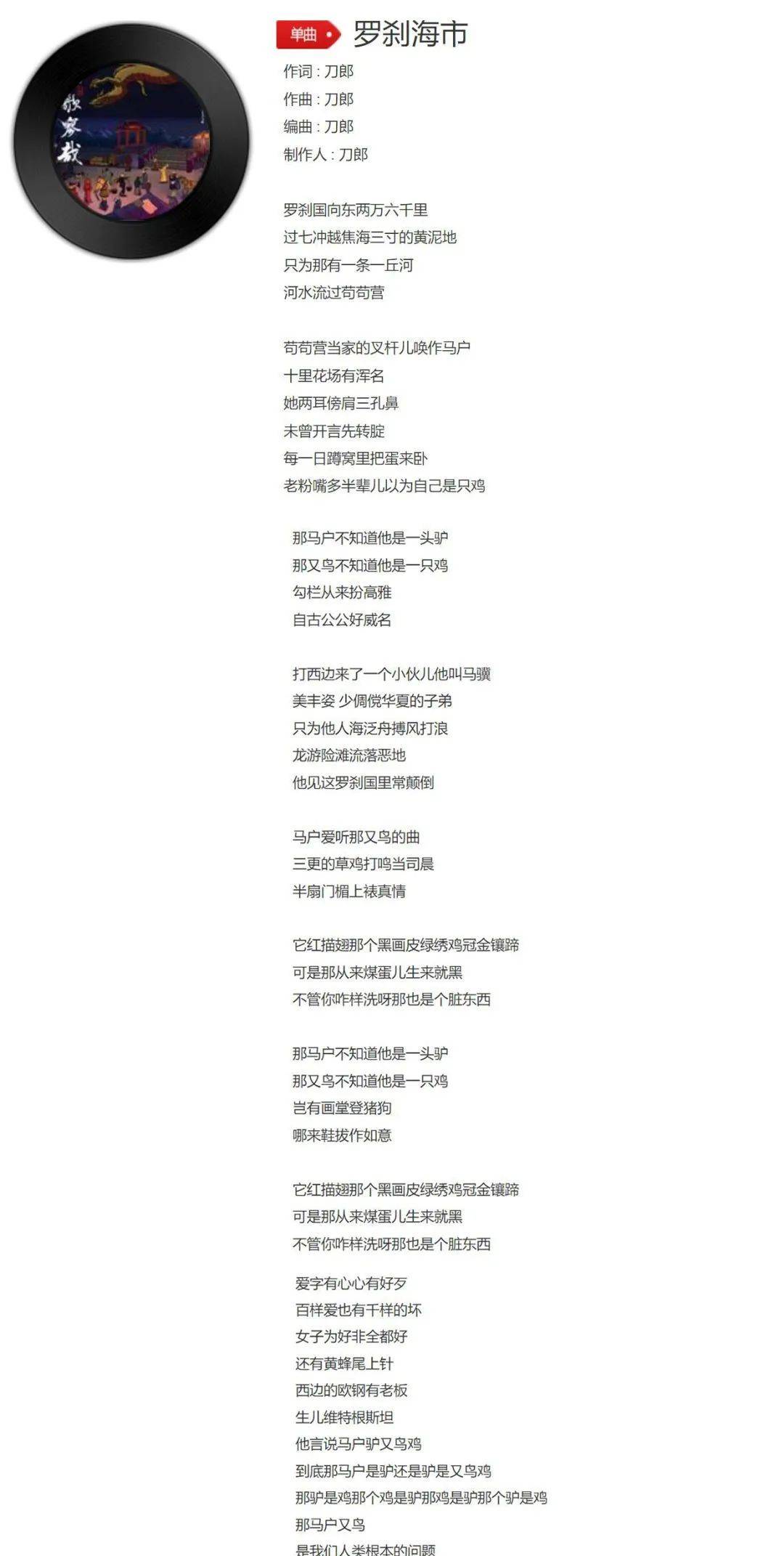 而歌曲《罗刹海市》也是结合小说的主题进行了填词,歌词内容极具批判与嘲讽意味。