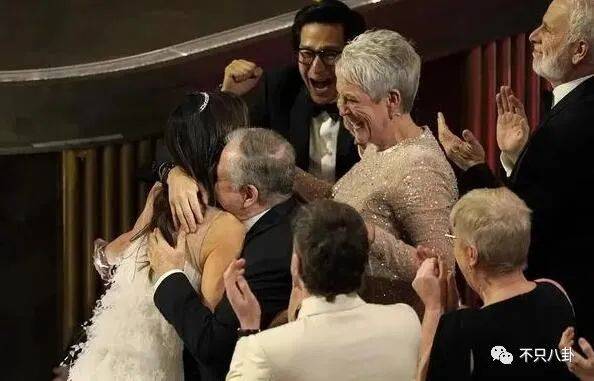 杨紫琼和托德激动相拥,面前摆着的是象征杨紫琼职业荣耀的奥斯卡小金人。
