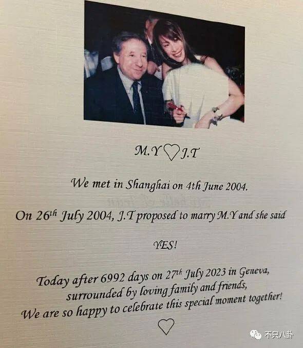 让·托德今年77岁,杨紫琼61岁,婚礼邀请函上记录了两人这19年的爱情故事。