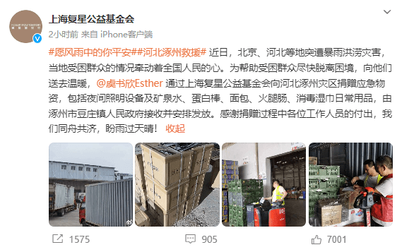 8月3日,上海复星公益金机会发文称,虞书欣通过上海复星公益基金会向河北涿州灾区捐赠应急物资。包括夜间照明设备及矿泉水、蛋白棒、面包、火腿肠、消毒湿巾日常用品,由涿州市豆庄镇人民政府接收并安排发放。感谢捐赠过程中各位工作人员的付出,我们同舟共济,盼雨过天晴!