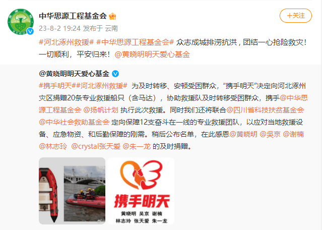 搜狐娱乐讯 8月2日,据中华思源工程基金会官微消息:为及时转移、安顿受困群众,“携手明天”决定向河北涿州灾区捐赠20条专业救援船只(含马达),协助救援队及时转移受困群众,携手中华思源工程基金会扬帆计划执行此次救援。同时还将联合四川省科技扶贫基金会中华社会救助基金会定向保障12支奋斗在一线的专业救援团队,以应对当地救援设备、应急物资、和后勤保障的刚需。稍后公布名单,在此感恩黄晓明、吳京、谢楠、林志玲、张天爱、朱一龙的及时捐赠。