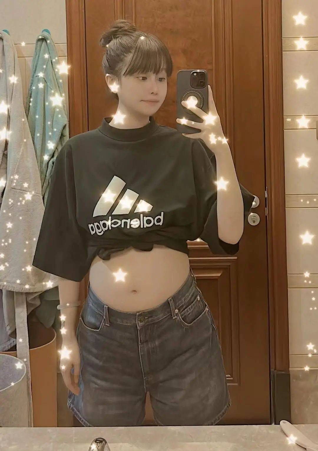 小妹儿觉得作为四个月来说,球球的肚子确实显怀不少,看上去像五个月左右。但是球球的状态看起来很好,她素颜出镜,扎着可爱的丸子髻,穿着简约的黑色T恤和牛仔短裤。