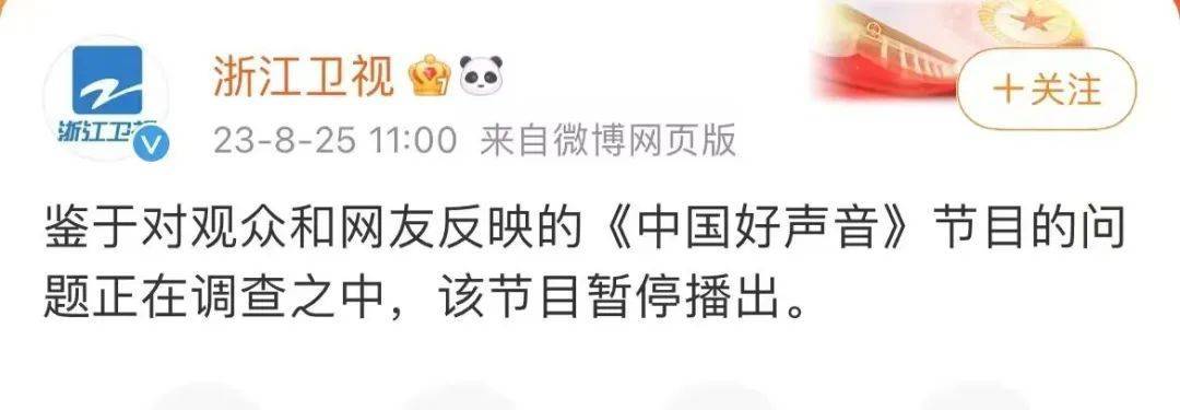 8月25日11时,浙江卫视官方微博称,“鉴于对观众和网友反映的《中国好声音》节目的问题正在调查之中,该节目暂停播出。”当天晚些时候星空华文发布公告,称“全力支持浙江卫视的该决定及行动”。