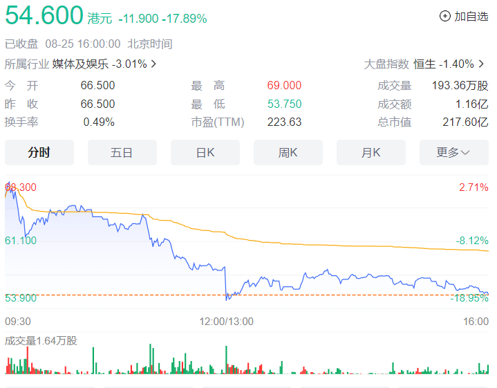 8月25日,灿星制作的母公司星空华文收盘价为54.6港元,市值217.6亿港币;而8月17日的收盘价是124港元。总计6个交易日,累计跌去了超过270亿港元,这很可能是今年文娱类公司最惨烈的跌幅。