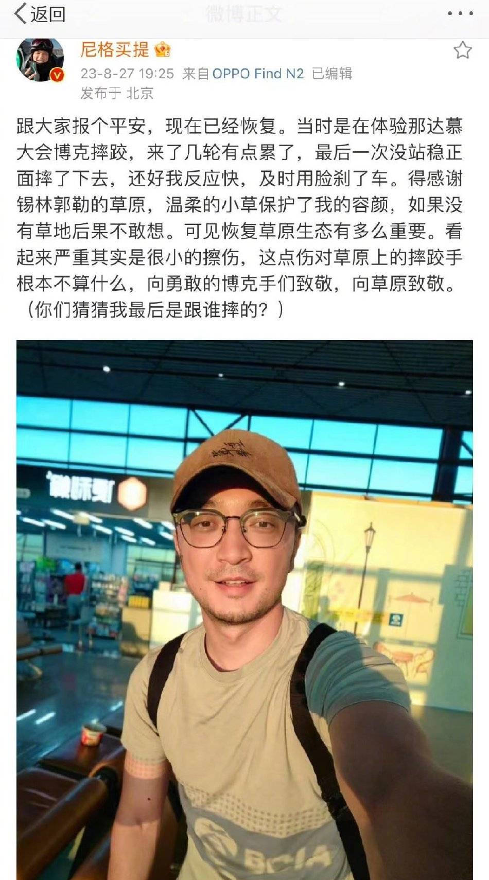 搜狐娱乐讯 8月27日,尼格买提发文回应录制节目时受伤,并跟大家报平安“还好我反应快,及时用脸刹了车。”尼格买提还感谢了撒贝宁,保护了他的脸。