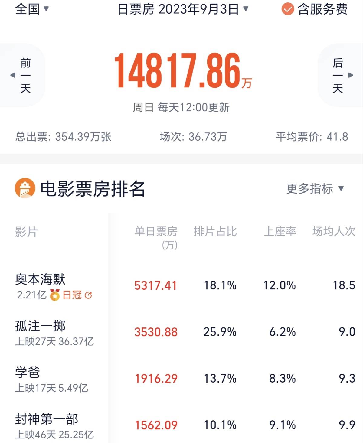 该片热度日增,单日票房、上座率、场均人次均高居第一,远远甩开了大热国产片《孤注一掷》。按此走势,猫眼专业版、灯塔专业版预测其最终总票房可能冲5亿元,甚至更高。