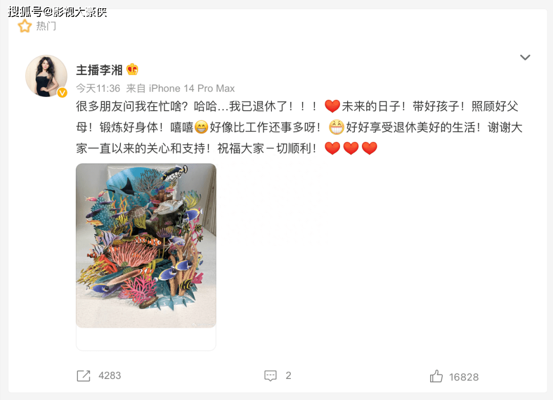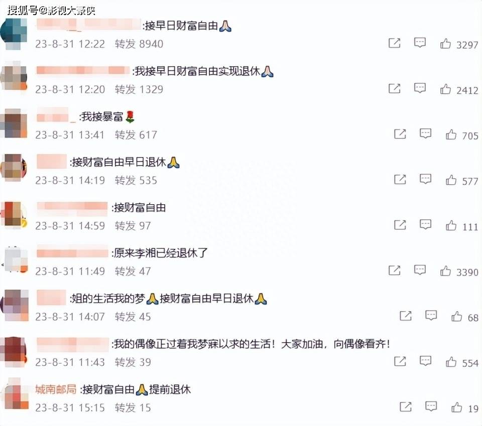 目前,李湘官宣退休的微博已经成为网友的打开点,数万网友转发刷屏喊话:“姐的生活我的梦!接财富自由早日退休!”