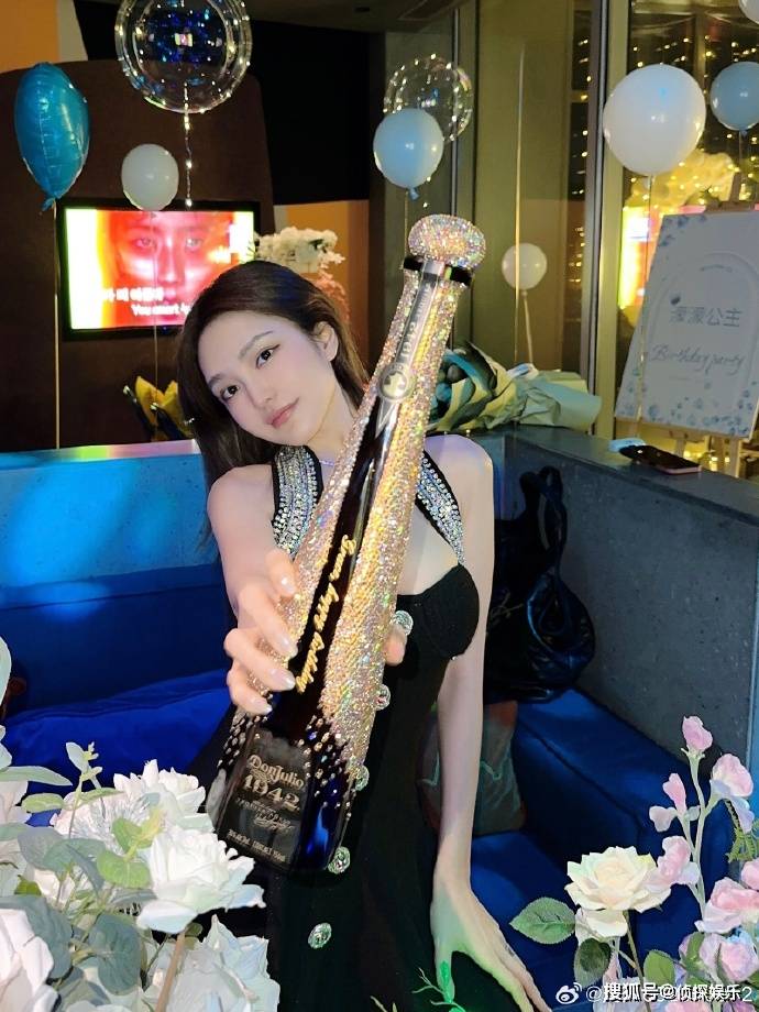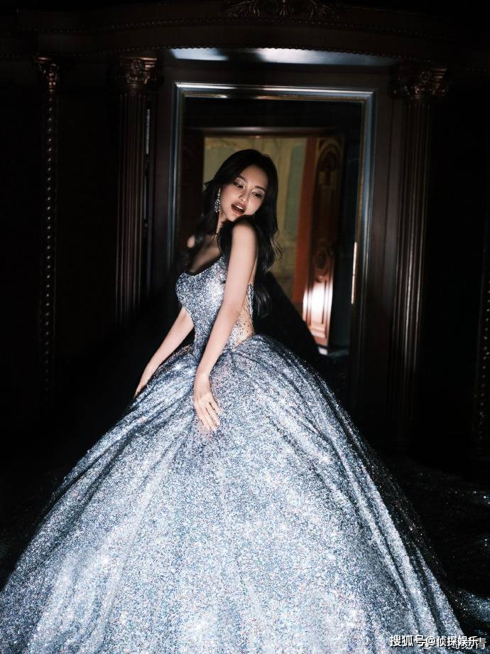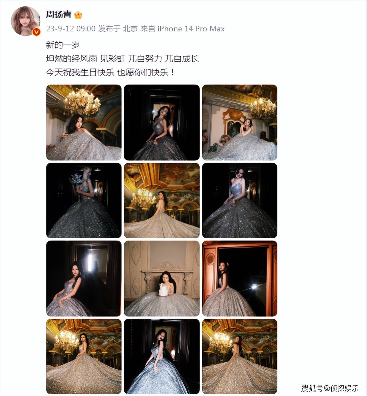 12日上午九点,周扬青再度在大号里上传了多张生日美照,这一套和前面的辣妹look不一样,一袭抹胸亮片裙尽显贵气、优雅。