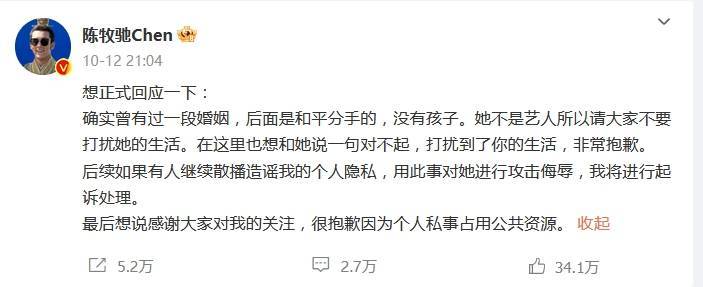 而此前12日,陈牧驰发文回应网传他曾结婚又离婚一事,全文如下: