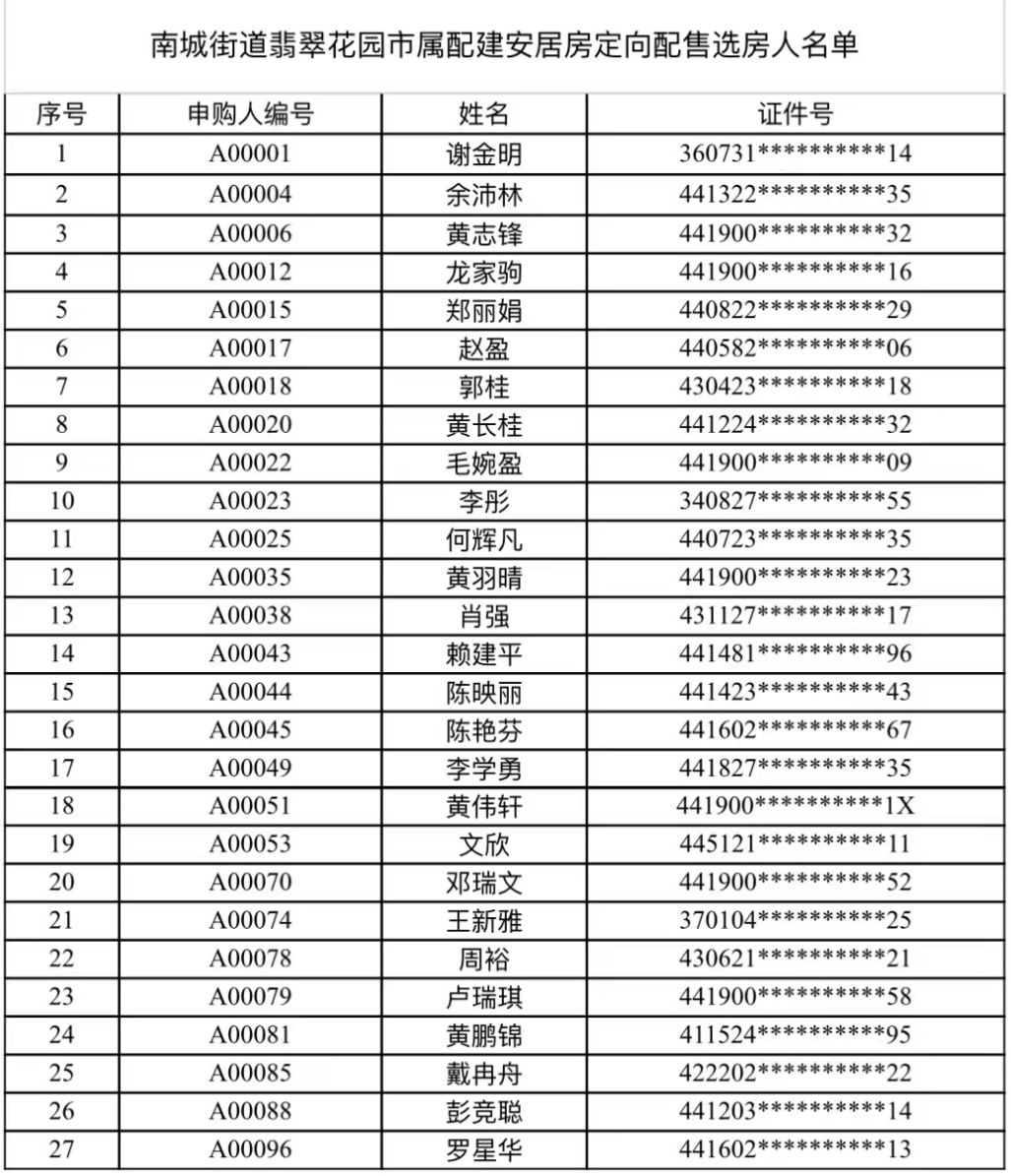 东莞市南城街道翡翠花园安居房选房人名单公示