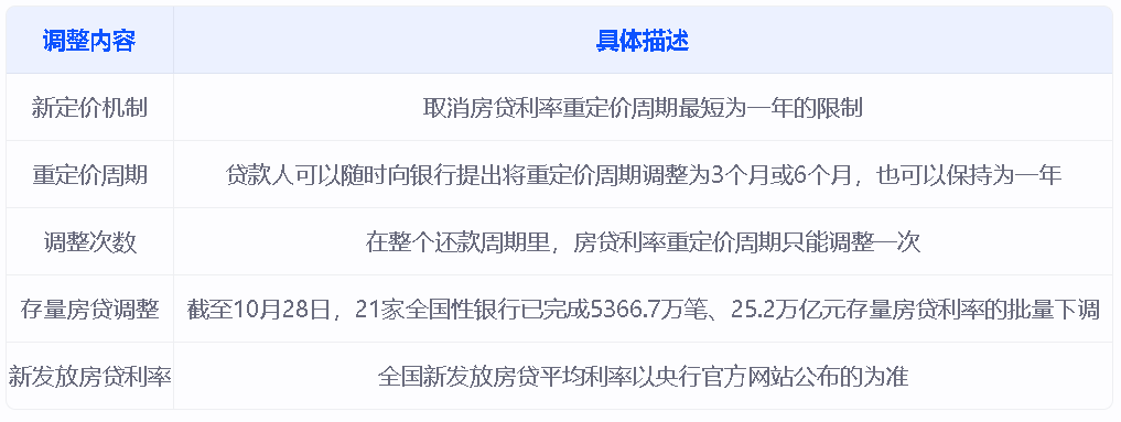 从11月1日起,六大商业银行将对商业性个人住房贷款利率实行新的定价机制,取消了房贷利率重定价周期最短为一年的限制,以落实央行此前发布的相关要求。贷款人可随时向银行提出将重定价周期调整为3个月或6个月,或保持为一年,但整个还款周期内只能调整一次。
