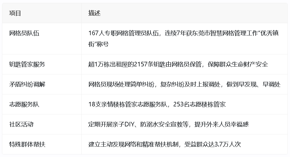 横沥镇的“网格共治”模式推动了网格员队伍不断创新管理方式和理念,增强了外来人员的归属感、获得感和幸福感,形成了“党组织主抓+网格力量力推+各方积极参与”的社会治理格局。该做法获评全国新时代“枫桥经验”优秀案例。