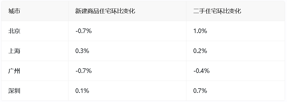 与此同时,一线城市二手住宅价格近13个月以来首次转涨,由9月份的下降1.2%转为上涨0.4%。其中,北京、上海和深圳分别上涨1.0%、0.2%和0.7%,广州下降0.4%。