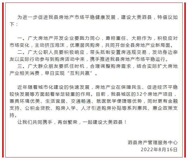 中新网8月17日电 “泗县发布”微信公众号16日消息,安徽省宿州市泗县发布《关于共创房地产业繁荣的倡议书》。倡议如下: