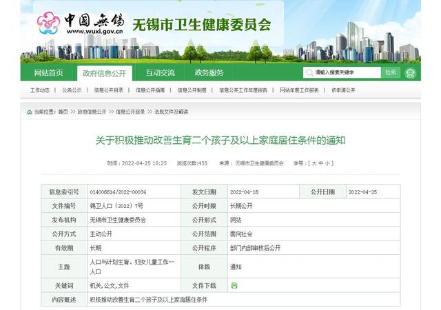 据悉,此次《通知》的实施对象为生育二个孩子及以上的无锡户籍居民家庭。