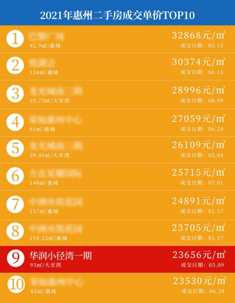 在惠州,华润置地的产品价值同样经得住市场考验。来自二手交易平台的数据显示,2021年惠州二手住宅成交价TOP10榜单中,华润小径湾一期的房源以23656元/㎡位居第九位。