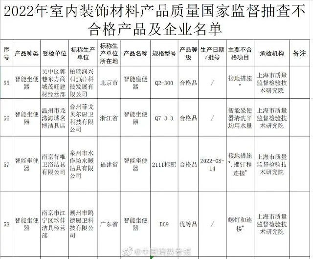 近日,国家市场监督管理总局发布2022年室内装饰材料产品质量国家监督抽查情况通报。本次在流通领域抽查11个省(市)85家企业生产的126批次智能坐便器产品,发现4批次产品不合格,涉及:标称柏瑞润兴(北京)科技发展有限公司生产的智能坐便器(规格型号Q2-300)、标称台州菲戈贝尔厨卫科技有限公司生产的智能坐便器(规格型号Q7-3-3)、标称泉州市水作坊水暖洁具有限公司生产的智能坐便器(规格型号2111标配;生产日期/批号2022-08-14)、标称潮州市鸥德厨卫科技有限公司生产的智能坐便器(规格型号D09)。( 来源:中国消费者报 )
