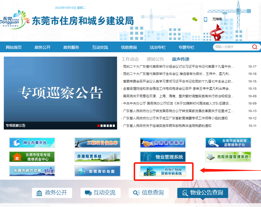申购人可在2023年6月20日至6月25日登录网址:东莞市住房和城乡建设局http://zjj.dg.gov.cn/,点击共有产权房资格审核系统图标进入,如下图: