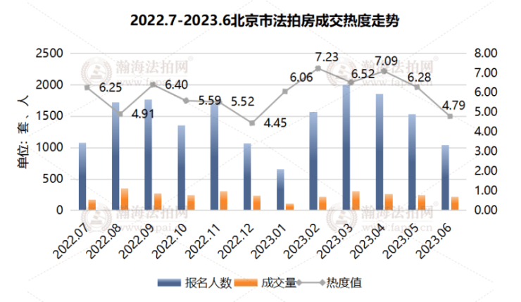 法拍房一直被称为“捡漏房”。据瀚海数据研究院数据显示,2023年上半年,北京市法拍房市场共计挂牌上拍房源有3685套,成交法拍房1356套,成交率为44.52%(除去撤拍套数),成交总金额为116.69亿元。值得关注的是,上半年共计有8657人参拍,平均6.4人争抢1套房,平均成交折扣为7.7折。