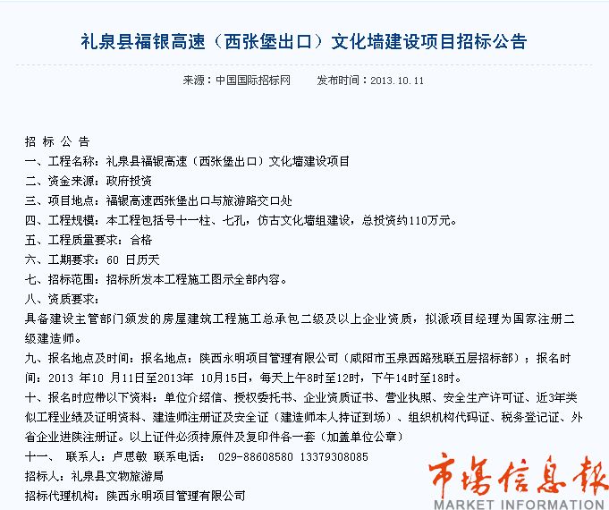 市场信息报【记者 谈春平】仿古文化墙在没有招投标的情况下已经完工,主管单位礼泉县旅游局称文化墙是县上作为创建省级旅游示范县的重点项目。明目张胆的违规建设在受到当地纪律检查委员会的处罚后,招标手续目前还在完善中。