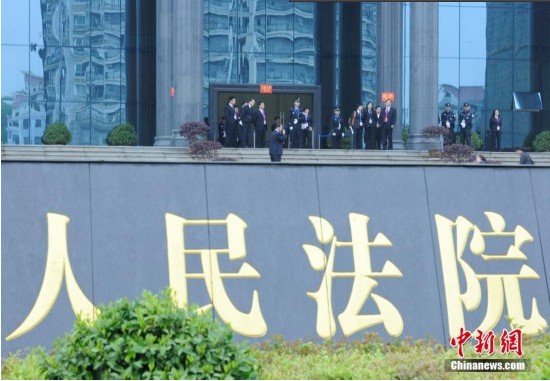 3月31日上午,刘汉、刘维等36人涉嫌组织、领导、参加黑社会性质组织以及故意杀人、包庇、纵容黑社会性质组织等案件由湖北省咸宁市中级法院一审公开开庭审理。图为当天咸宁法院外景。中新社发 侯宇 摄
