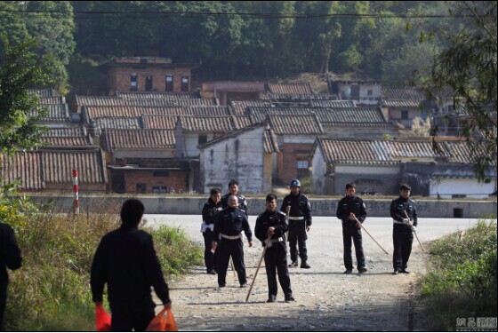 民警从张家拿来张玉南的衣服和鞋子。一名民警剪下一块衣兜,放入塑料袋中,给警犬闻味道后,随后兵分两路进行追踪。同一时间,相邻的云浮市新兴县、佛山市高明区的警方也开展搜捕。图为警察手持棍棒进山搜捕。