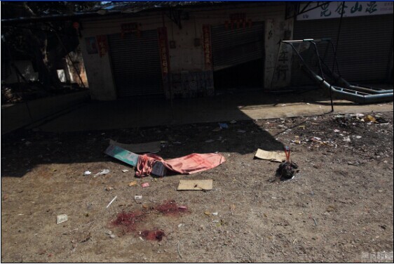 据知情人透露,张玉南因与黄某有感情纠葛决意报复,持刀刺伤黄某,刺死黄某的丈夫周某、徐某后潜逃,导致2死1重伤。图为事发地留有的一大滩血迹。