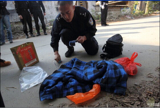 1月14日晚,51岁的鹤山双合镇村民张玉南带着一把20多厘米长的刀搭车,从双合圩镇来到合成村,他的目标是在村内开士多的女子黄某。图为警方在对嫌犯家里搜集到的衣物进行味源的收集。