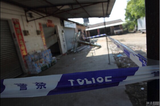 “她头部、鼻子都被砍了好几刀,出了好多血。她的老公周某更惨,腹部、头部、颈部被砍了10多刀。徐某也中了好多刀。”根据目击村民和法医的描述,黄某的丈夫周某及士多旁边开摩托车修理店的徐某当场身亡。图为事发地,事发周围拉起了警戒线。
