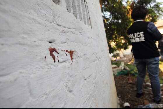 案发后2小时,鹤山市公安局已经调派大批警力到达合成村,并设卡控制附近出入口。图为离事发地不远的墙面上留有的嫌犯逃走时留下的血迹。