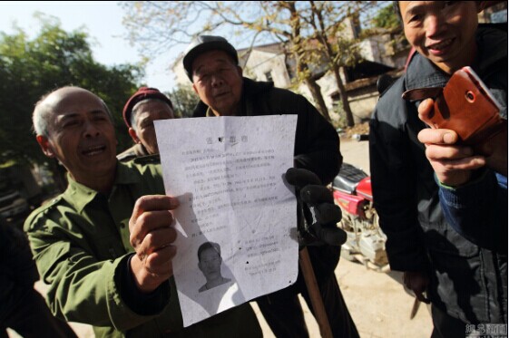 15日上午9时许,南都记者在搜索现场看到,在距合成村大约十余公里的双合公路处,警察设卡检查可疑车辆。图为村民拿着协查通报议论。