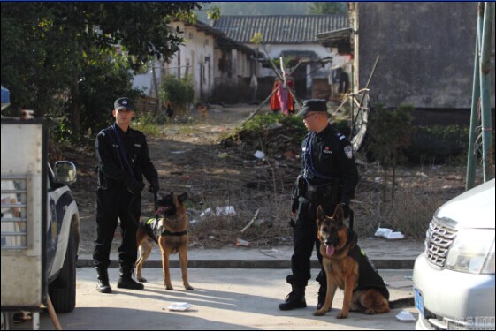 15日上午10时,警方在包围圈稳定后,将警力分成若干小组,深入双合镇各村盘查,各出入口都可见到全副武装的、三五成群的民警和治安员。图为警方派出警犬准备进行搜捕。