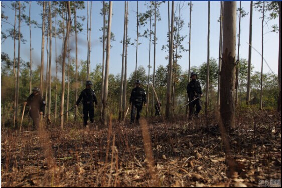 天黑之前,张玉南的踪迹终于被一队深入距离案发现场大约7公里的双合镇鹤岭村内搜捕的民警发现。随后大队民警增援,很快将已如惊弓之鸟的张玉南逮捕。15日19时许,嫌疑人张某被民警押至派出所,警方已经开展审讯。图为警察手持棍棒进山搜捕。