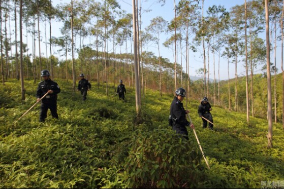 15日15时许,省公安厅、江门市公安局刑警来到现场,并且带来了4只警犬。据悉,张玉南未婚,家里还有一个七八十岁的母亲。图为警察手持棍棒进山搜捕。