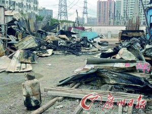 记者在现场看到,整个建材堆放地点附近没有正规的消防设施,各铁皮房之间横七竖八地拉着电线。(来源:广州日报)
