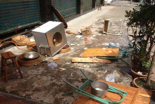 两名受伤者感觉到吃了亏,立即叫来了几名老乡。但四周找遍了都没有找到打人者,为了泄愤他们于是将整个早餐店乱砸一通。“的确是我砸的。”被打的男子说,他仅仅是抱怨早餐店门口的石头挡道了,就被打了,感觉到太不可思议了。