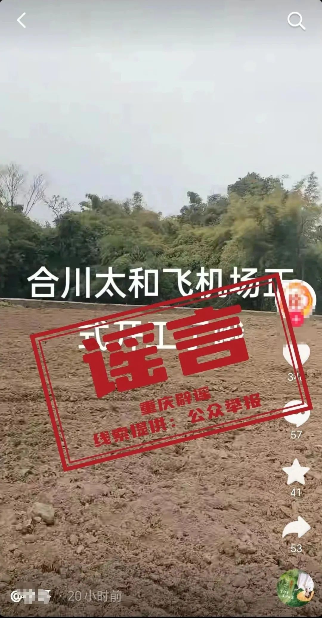 经核查,网民在网上发布的图片系太和镇土地整治项目。当地某网民为吸引“流量”博取“眼球”,就怀着“搞起耍”的心态,在网上编造了“合川太和飞机场正式开工了”的谣言。
