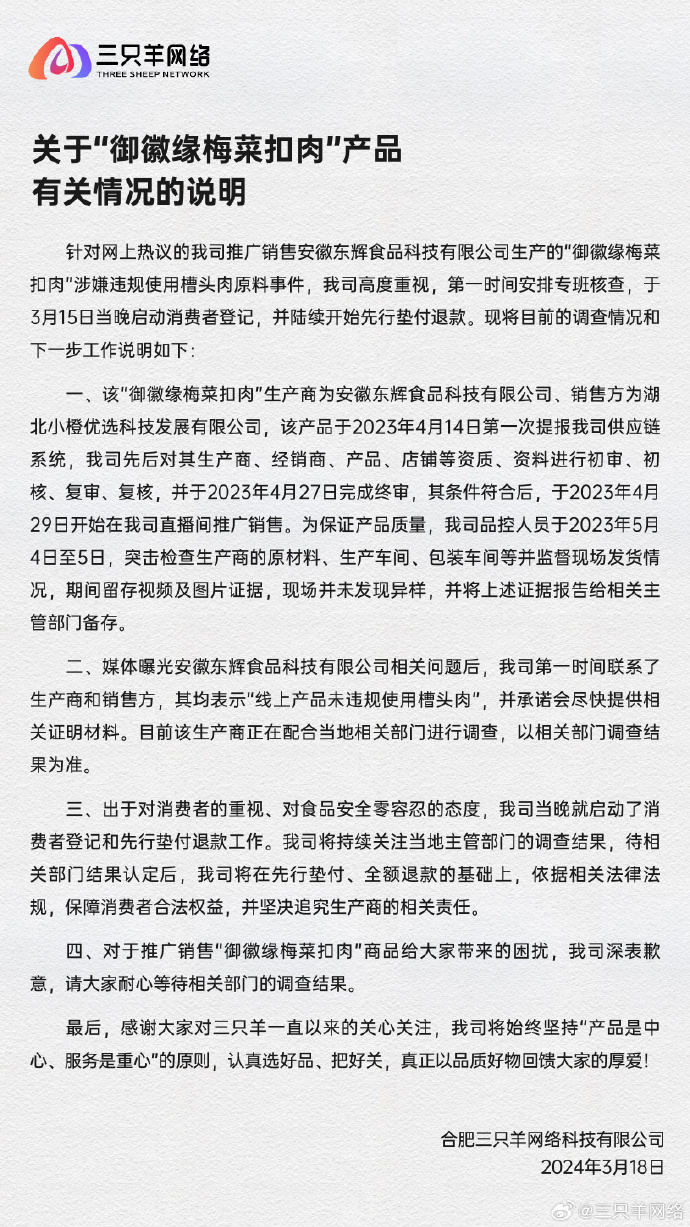 18日,小杨哥公司三只羊网络发文回应315点名槽头肉一事。 三只羊网络称高度重视,已于第一时间安排核查,并于3月15日当晚启动消费者登记,并陆续开始先行垫付退款。其销售的”御徽缘梅菜扣肉“的生产商和销售方表示”未使用槽头肉“。同时表示,对于推广销售"御徽缘梅菜扣肉"商品给大家带来的困扰,我司深表歉意,请大家耐心等待相关部门的调查结果。