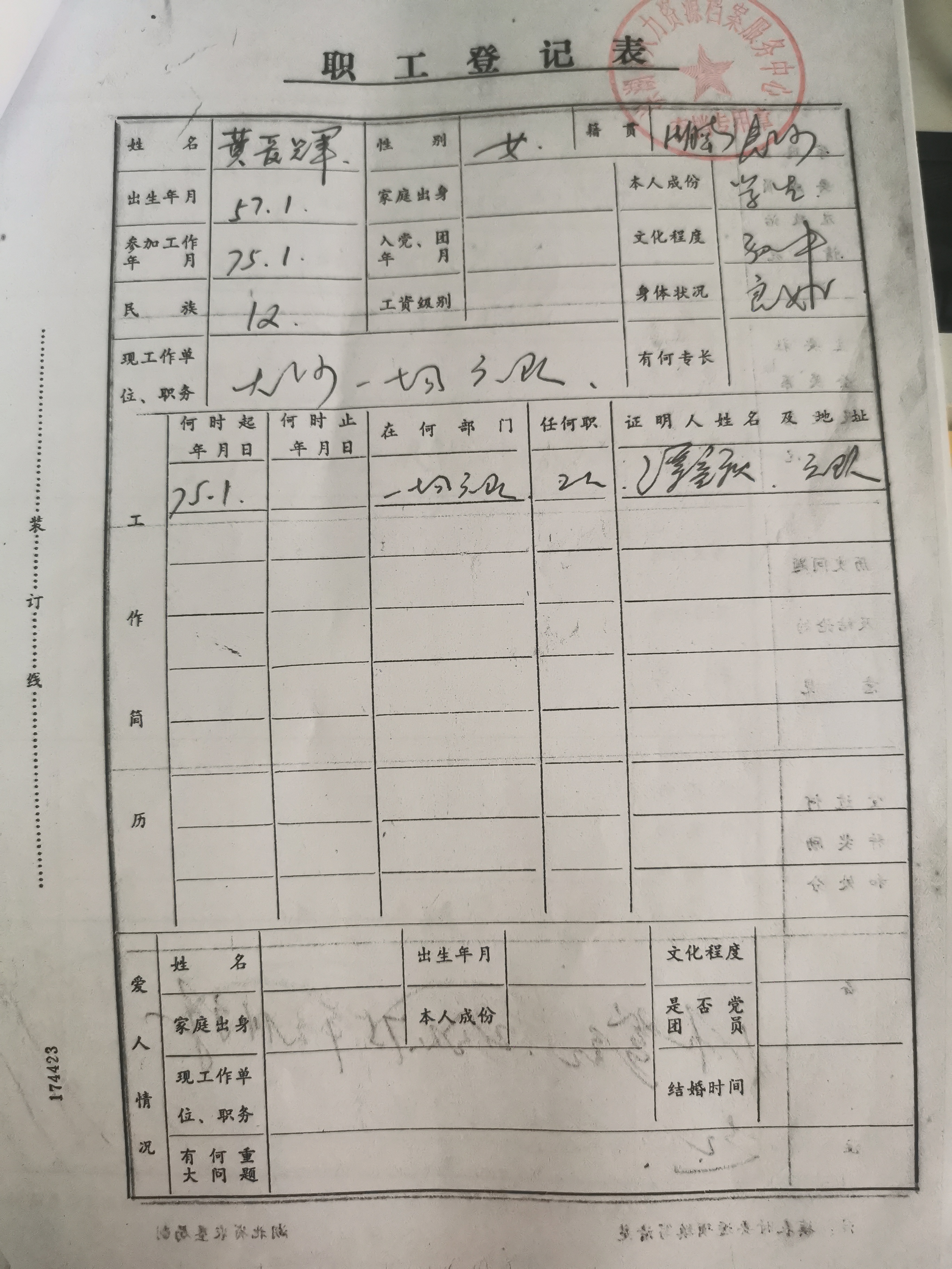 1975年1月,黄爱辉在从湖南前往湖北省洪湖市大沙湖农场工作,记者在文新宇出示的《职工登记表》翻拍照片上,看到该表格的人员基础信息均是手工填写,表格没有照片一栏。还有一份2004年5月份的《参加养老保险人员资格审批表》上,同样是手工填写的人员基础信息,虽然表格上有照片一栏,却没有贴上照片。