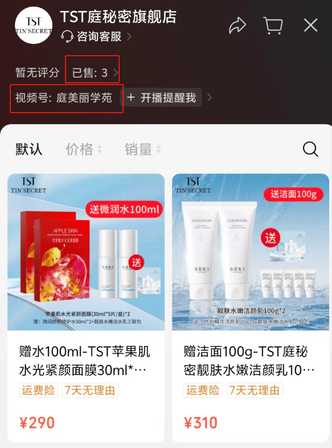 目前,视频号“庭美丽学苑”关联了店铺“TST庭秘密旗舰店”,产品包括面膜、乳液和保湿水等。截至发稿,该店的开店时长为65天,全店销量为3件。